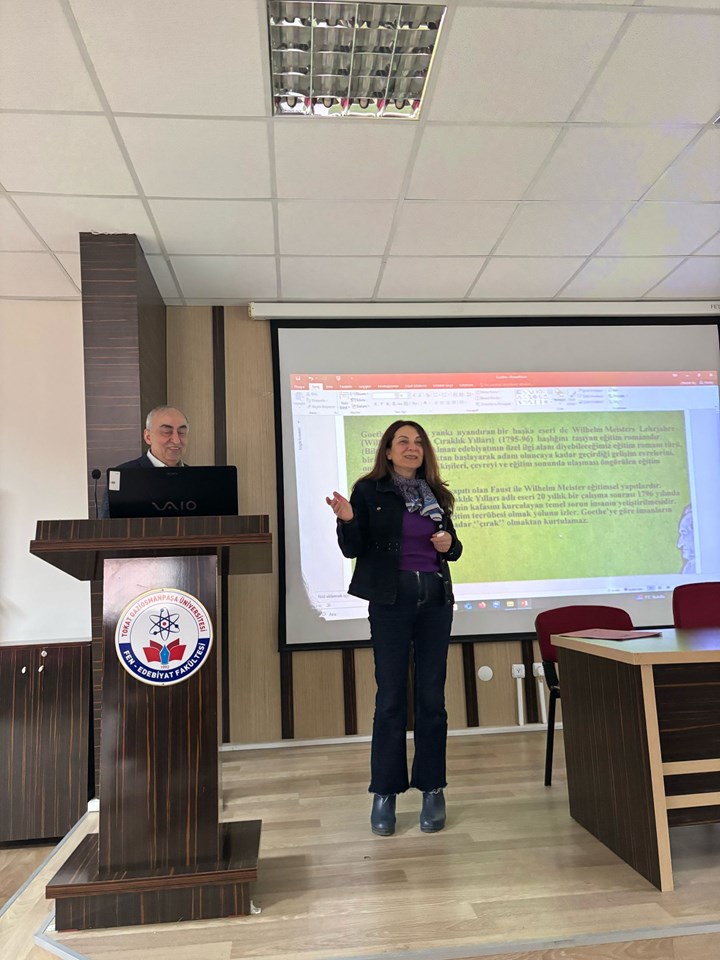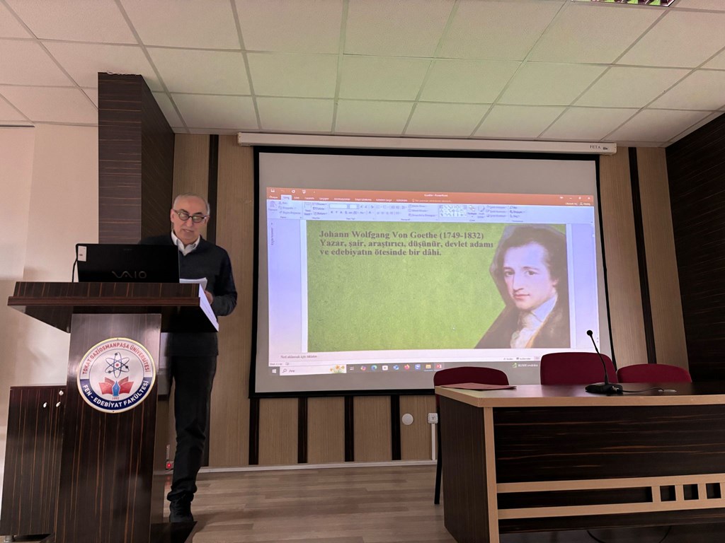 Fen Edebiyat fakültemiz Batı Dilleri ve Edebiyatları bölümü Dr. Öğr. Üyesi Ömer Lütfi İspirli, ünlü Alman yazar Johann Wolfgang von Goethe’nin hayatını anlatan bir sunum gerçekleştirdi. Bu sunum, Batı Dilleri ve Edebiyatları Bölümü’nün “Bir Yazar Bir Hayat” seminer serisi kapsamında düzenlendi. Şehit Erdem Diker Konferans Salonunda düzenlenen etkinliğe Fen Edebiyat Fakültesi Dekanımız Prof. Dr. Alpaslan Demir, akademik personelimiz ile öğrenciler katıldı. İspirli, Goethe’nin edebiyat, bilim, felsefe ve din alanındaki katkılarını, eserlerini ve yaşam öyküsünü detaylı bir şekilde ele alarak dinleyicilere yazarın çok yönlü kişiliğini tanıttı. Etkinlik sonunda Batı Dilleri ve Edebiyatları bölümü başkanı Prof. Dr. Ayla OĞUZ, Dr. Öğr. Üyesi Ömer Lütfi İspirli’ye teşekkürlerini sundu ve etkinlik hatıra fotoğrafı çekilerek son buldu.