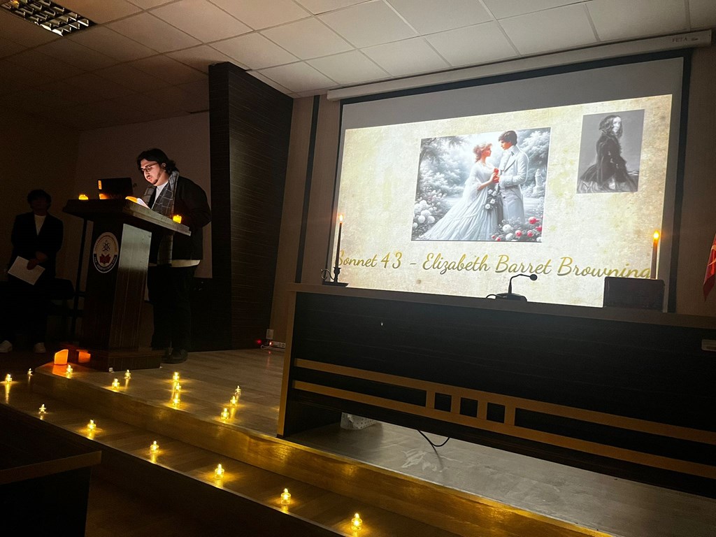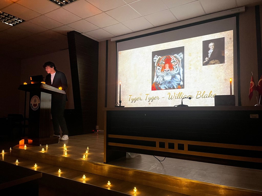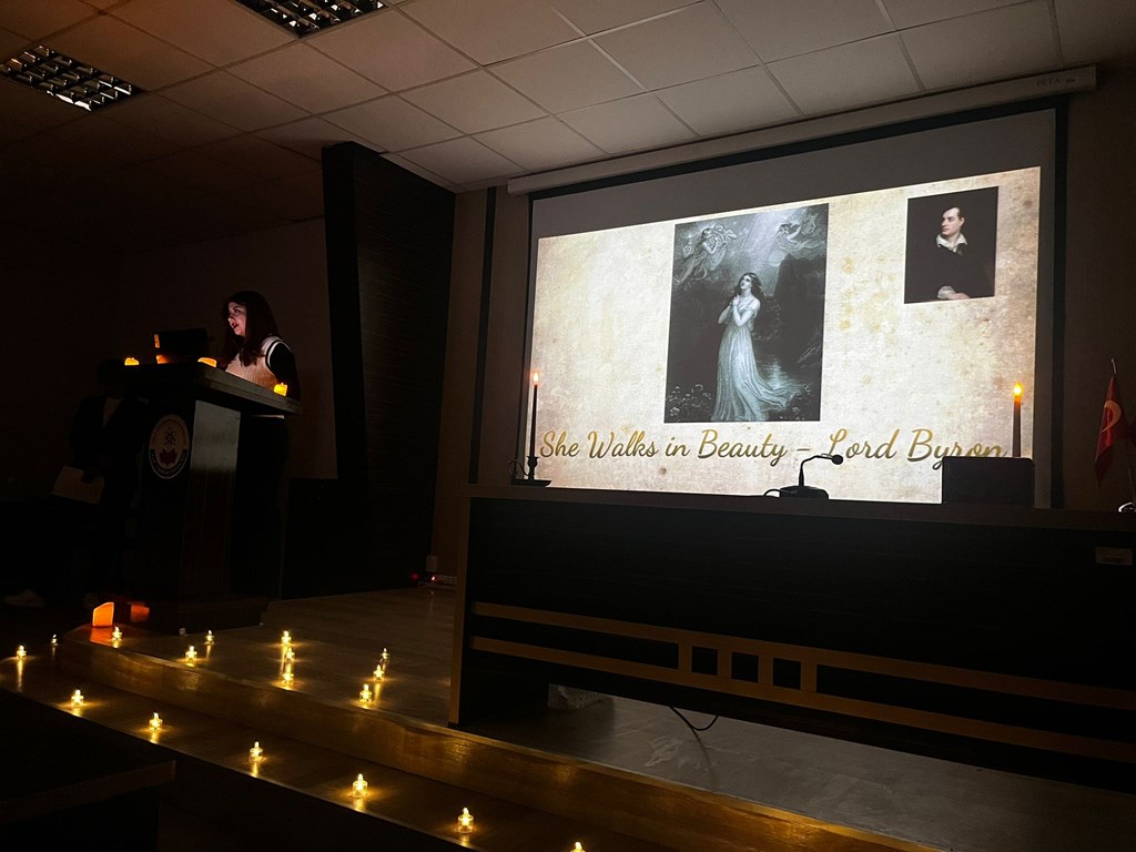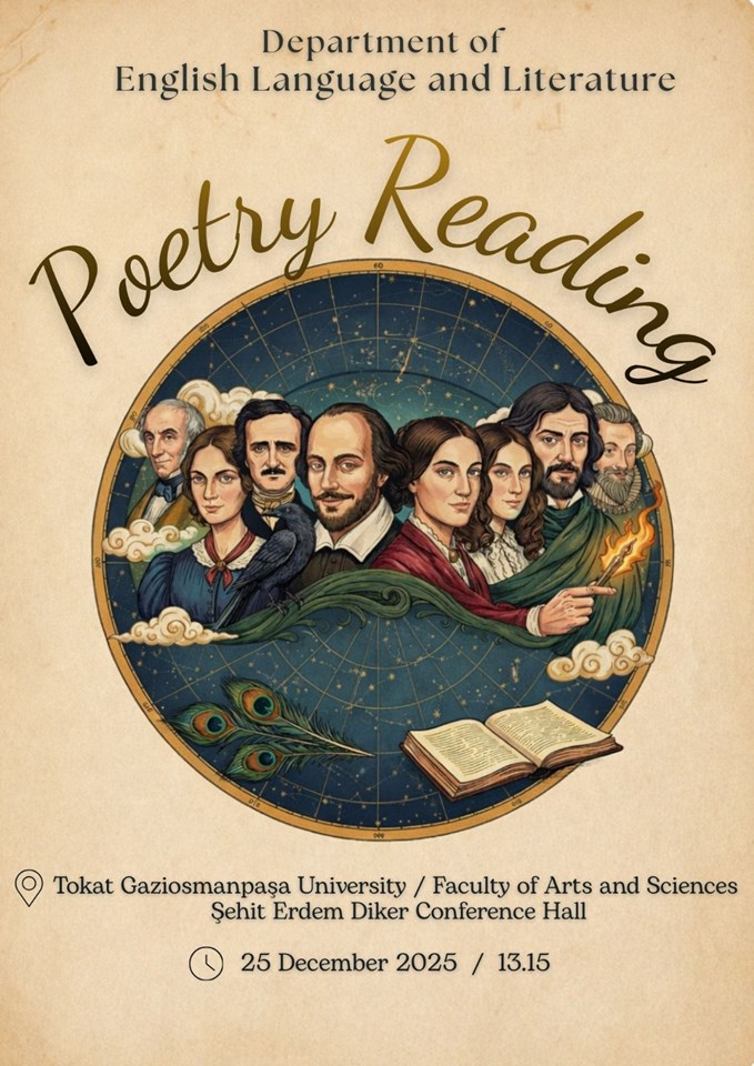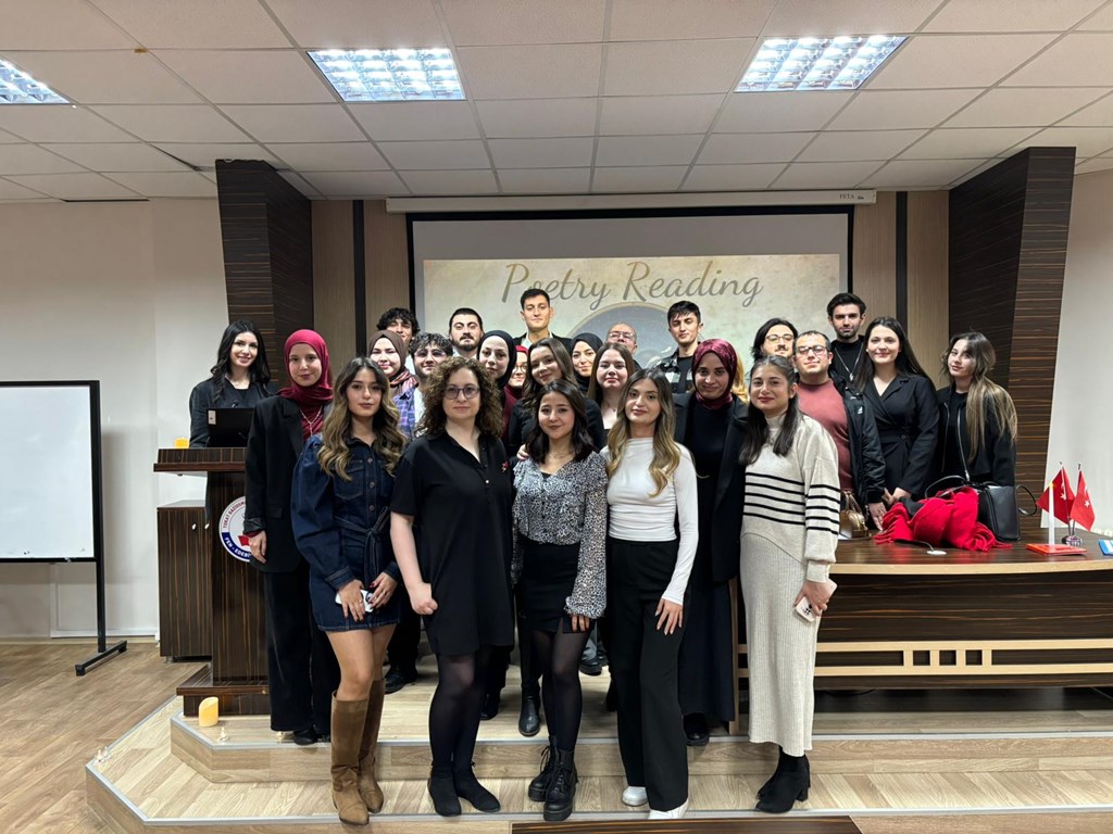 Bölümümüzün öğretim üyelerinden Dr. Nihal DEMİRKOL AZAK'ın rehberliğinde, üçüncü ve dördüncü sınıf öğrencilerimizin katılımıyla "Şiir Okuma Etkinliği" düzenlenmiştir. Etkinlikte İngiliz ve Amerikan edebiyatının farklı dönemlerinden seçkin şairlerin şiirlerine yer verilmiştir.